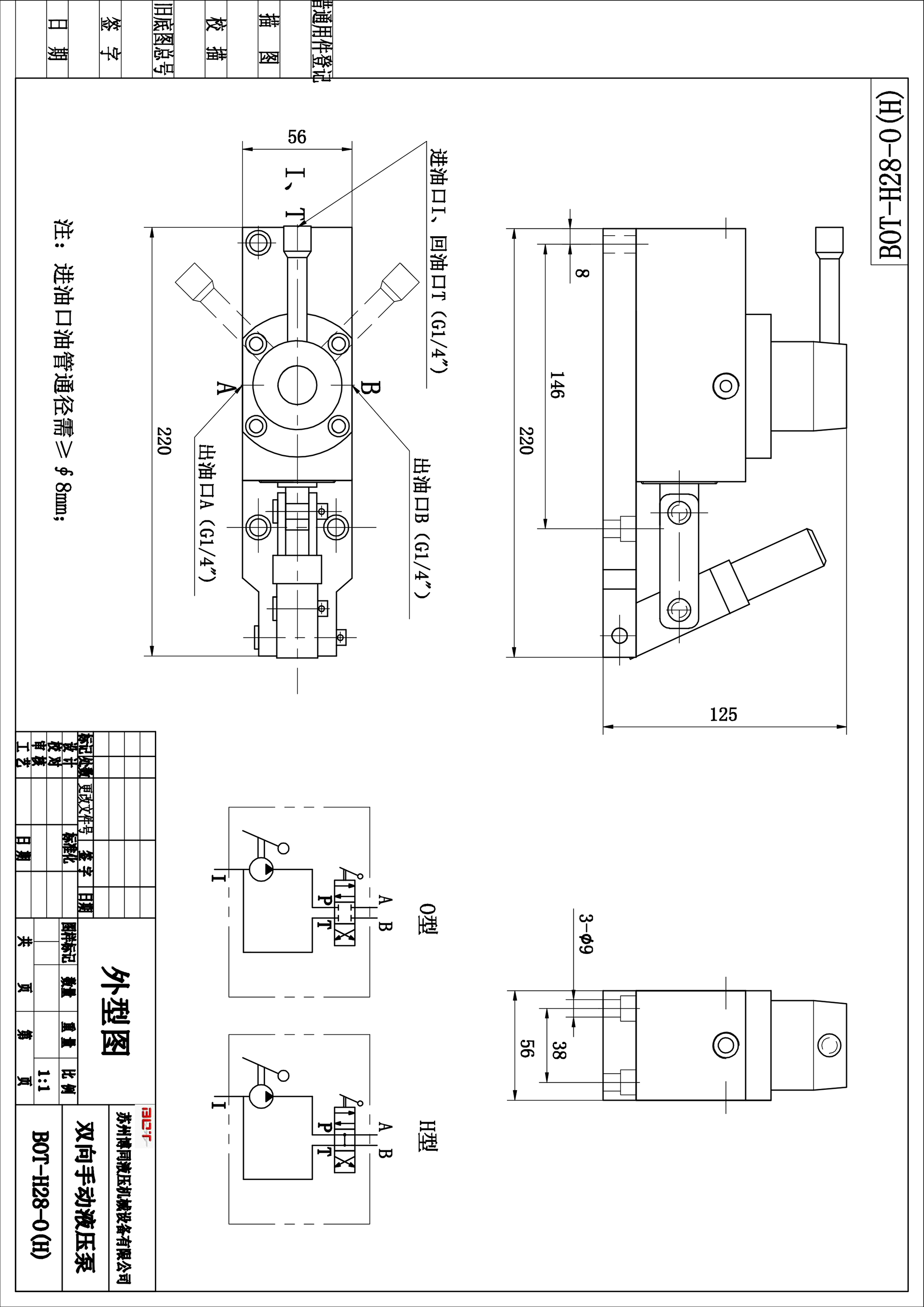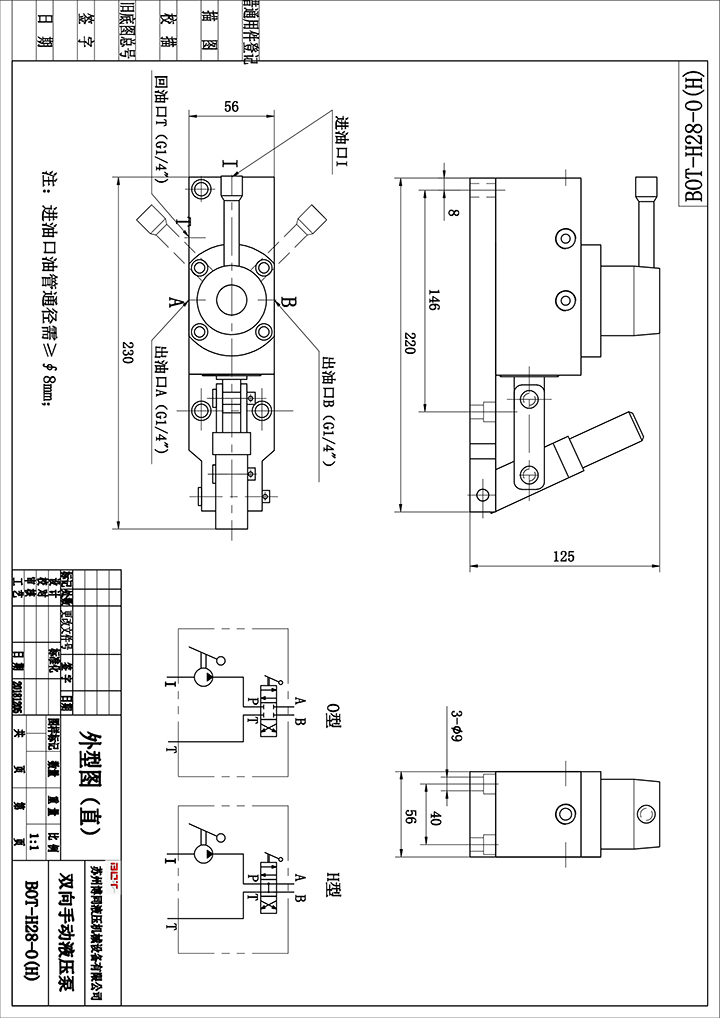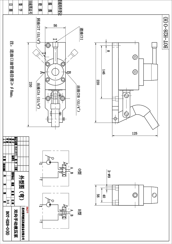 本雙向手動(dòng)液壓泵采用內(nèi)排內(nèi)泄結(jié)構(gòu)。換向集成與泵體一體,通過(guò)換向手柄轉(zhuǎn)動(dòng),可分別選擇出油A口或B口方向出油打壓,通過(guò)進(jìn)油口(回油口)吸油和回油,進(jìn)出油接口分別是G1/4;